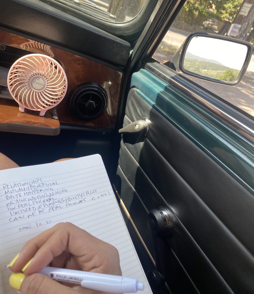 Remember to save this, pendeja, it’s not Google Drive, remember? You’re sitting up in the hills of Fiesole in your classic green MINI with the white racing stripes under lots of trees with very loud cicadas.