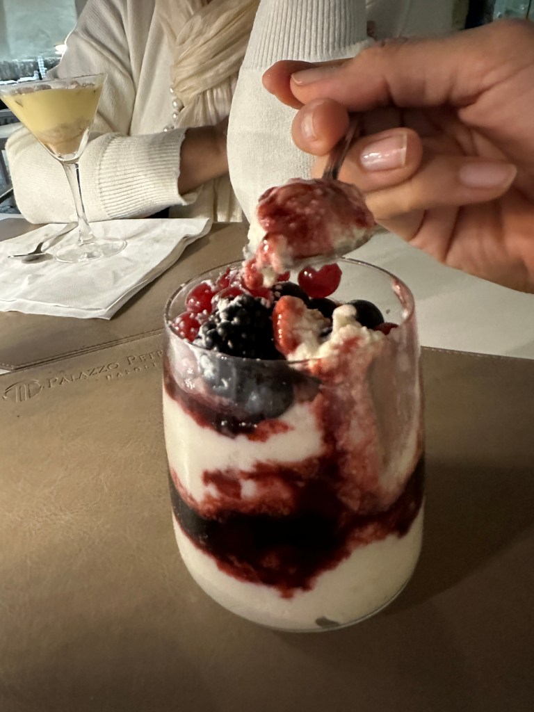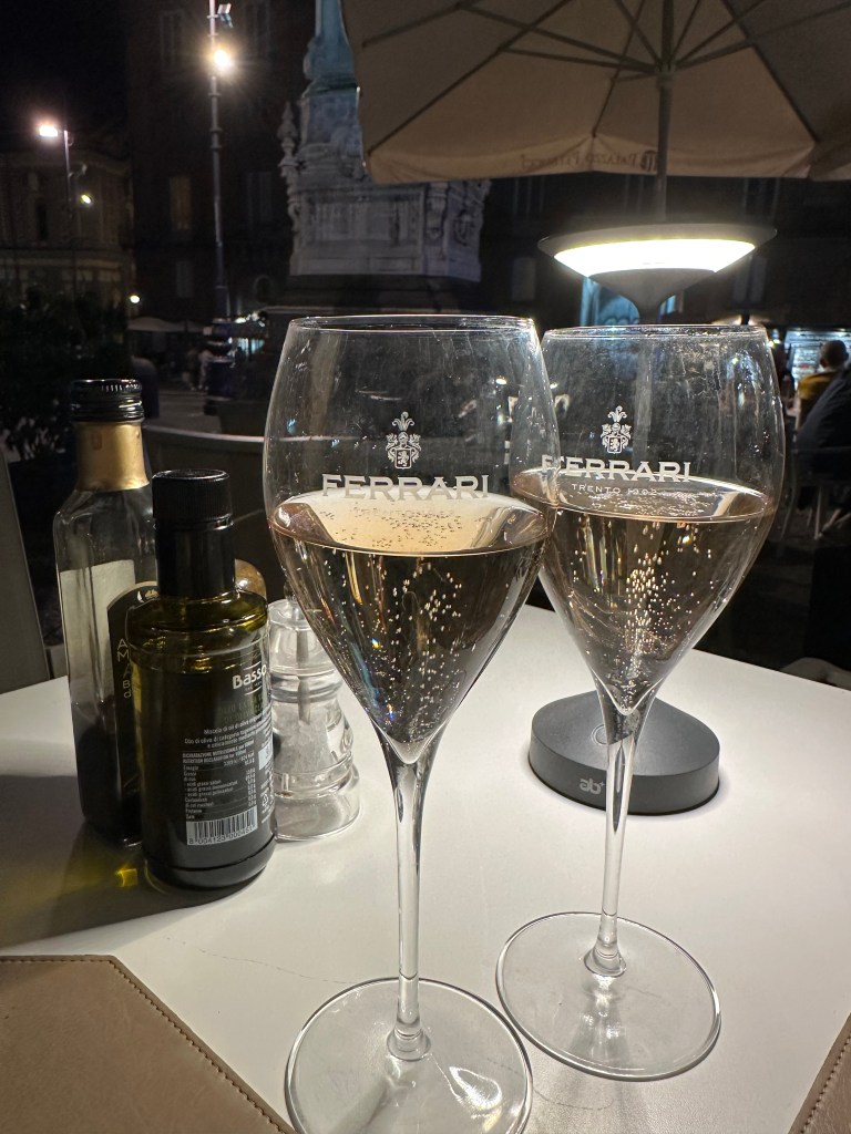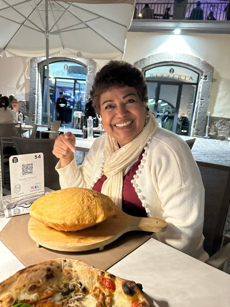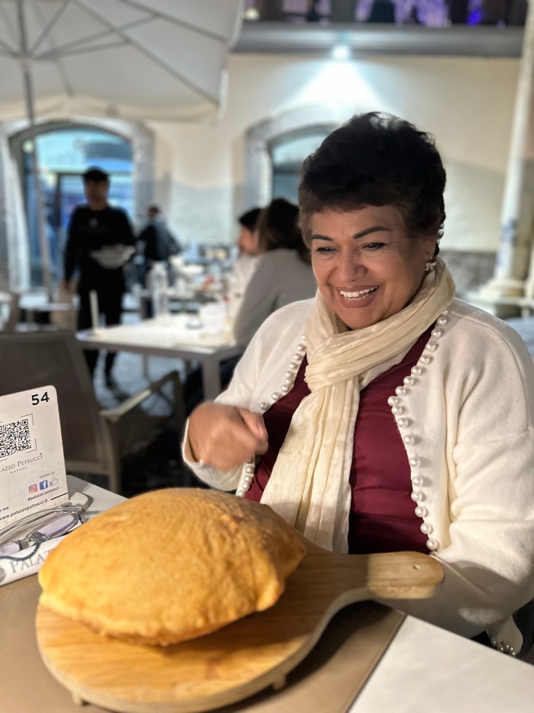We got back to Napoli with enough time for a nap and took our time getting ready for dinner at Palazzo Petrucci Pizzeria. We sat in the piazza (San Domenico Maggiore) and enjoyed the cool autumn air. We ordered a bottle of Franciacorta rosato to toast our health and time together, despite all the setbacks, things could be so much worse. Mamacat ordered the traditional fried calzone with added tomato sauce while I ordered a traditional pizza – the Davide Ruotolo 2.0. Both were phenomenal, especially mamacat’s cus it was SO fluffy and had bacon bits, yum!