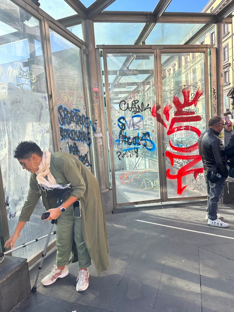 We were supposed to take the metro and a short train directly to the main entrance. Unfortunatelyyyy there turned out to be a public transportation sciopero that very day (a strike) which made that mode impossible.* And yet, I was determined to go through with the day trip cus I’d already planned everything! I’d pre-purchased our tickets, reserved the wheelchair, and I’d even planned a beautiful lunch at this place called Giardino dei Sensi. It was supposed to be magical, So we decided to take a taxi… of course that meant that instead of paying €10-€15 TOTAL round trip, we paid €75 just to GET there. :’) C’est la vie.