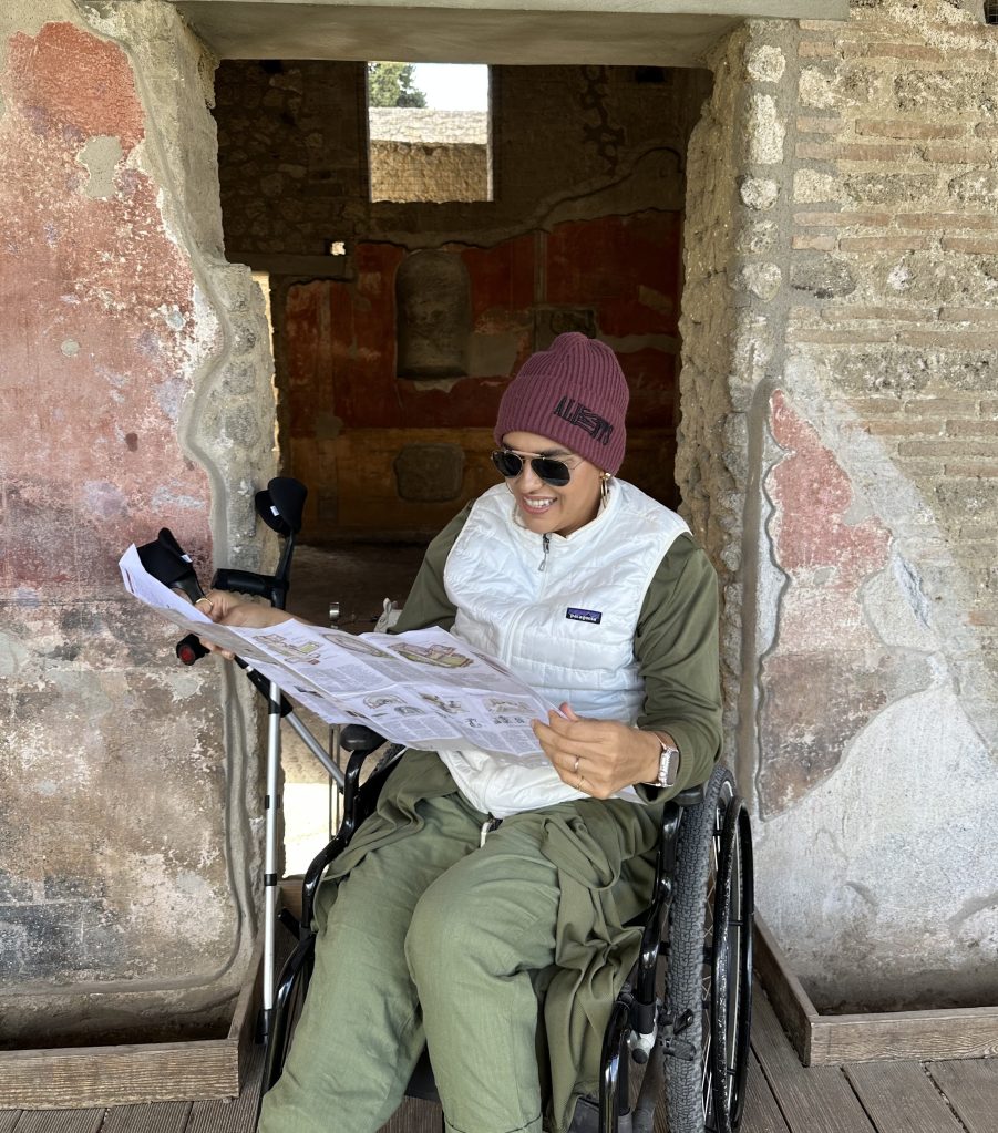 Okay, we forged on. We got dropped off at one of the three entrances, grabbed the wheelchair and started our exploration. The ruins have a wheelchair accessible route called “Pompei per tutti” (Pompeii for all) but man o man it was still quite rugged terrain (like, duh Patricia). We went as far as we could in order to make our 1:30pm lunch reservation. We had to return the chair at the same entrance (though to be fair, we (I) didn’t ask if we could return it at any other entrance) so we really only got to see the tiniest fraction given we had to take the same route back.