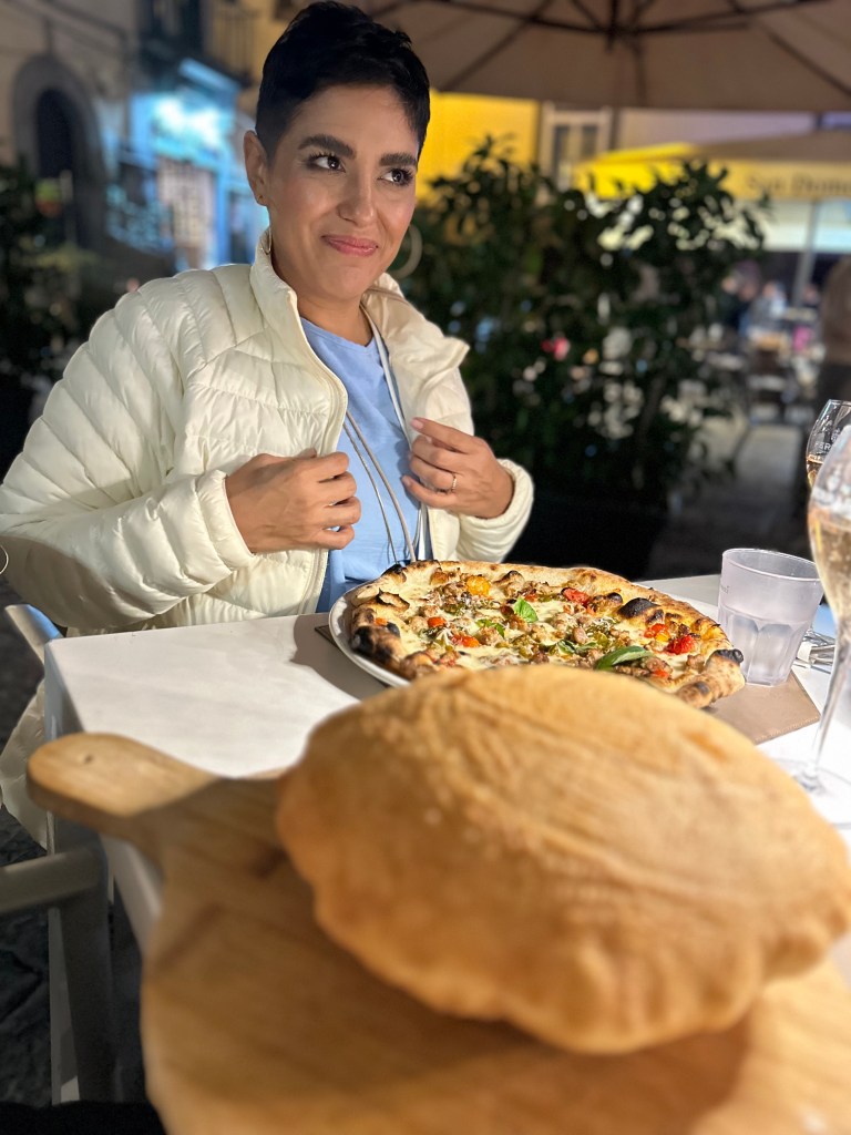 A tourist service point nearby had tried to help us with a cab to the restaurant. Luckily, they ended up having a shuttle back to Napoli with exactly two spots left! Tickets were a total of €35 which saved us €85. Hooray for real that time. Since we had about 45min, we ducked into the restaurant next door and scarfed down a pizza and a couple of glasses of wine (pain meds be damned)
