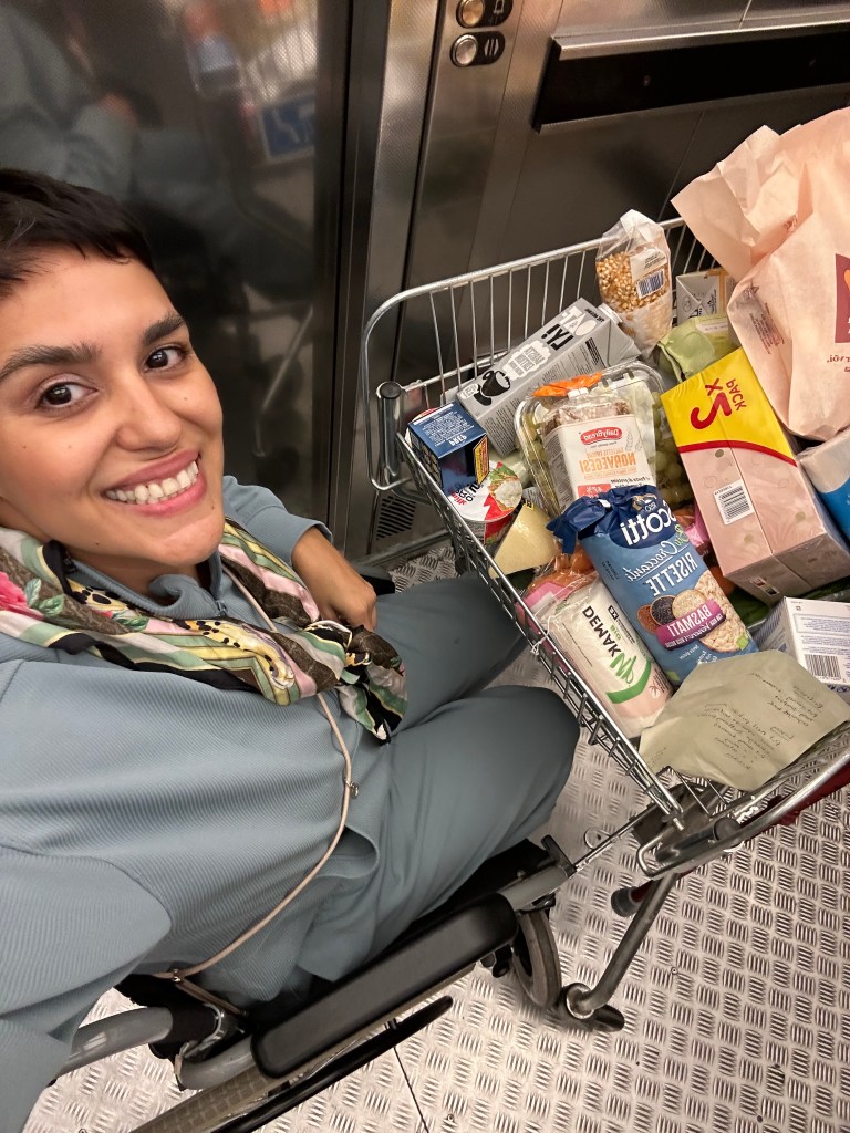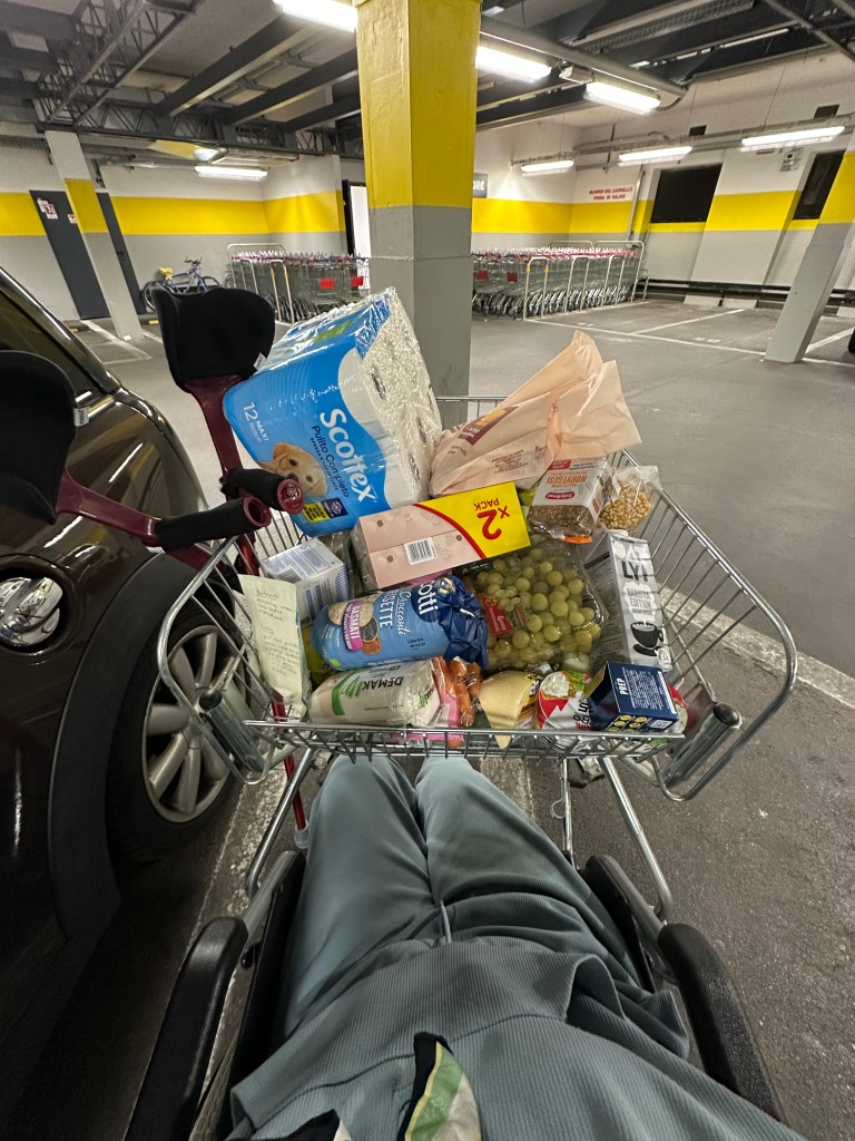 That meant that just walking to the bathroom was quite the journey. I also hadn’t thought about sitting while brushing my teeth or washing my face. The bedroom and main bathroom were upstairs, the kitchen and half bath were downstairs, so I kept the (rented) wheelchair downstairs, since that was where I needed it most.