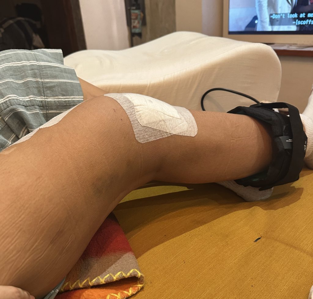 Back in my room, I woke up with a sturdy, locking-hinge, full leg brace. See image above. I’m not sure that’s the correct term but what I mean by locking hinge is that the brace allows for bending which can be limited (as is necessary) by locking the hinges at a specific degree. Mine was kept at 90° for the first two weeks. As is typical, I had drainage tubes, but rather than having them removed the following day, my surgeon’s protocol was to keep them in two days. The doctors who would check in on me morning and evening were skeptical about this practice. But in the end they were impressed with the amount of additional fluid that was drained thus majorly reducing swelling and bruising. I wouldn’t have known as much if I hadn’t had that first surgery where the back of my knee was the color of eggplant (aubergine for my EU friends) and the swelling made my knee twice its usual size.